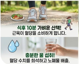 식사 후 가만히 앉아있거나 누워있으면 혈액 속 포도당이 그대로 지방으로 축적되거나 높은 혈당 수치를 유지하게 만듭니다. 식후 15분~20분 정도 가볍게 걷기 운동을 해보세요. 우리 몸의 근육(특히 허벅지 근육)은 에너지를 소모하기 위해 혈액 속의 당분을 적극적으로 끌어다 씁니다. 식후 산책은 인슐린의 도움 없이도 혈당을 직접적으로 낮출 수 있는 최고의 천연 혈당 강하제입니다.